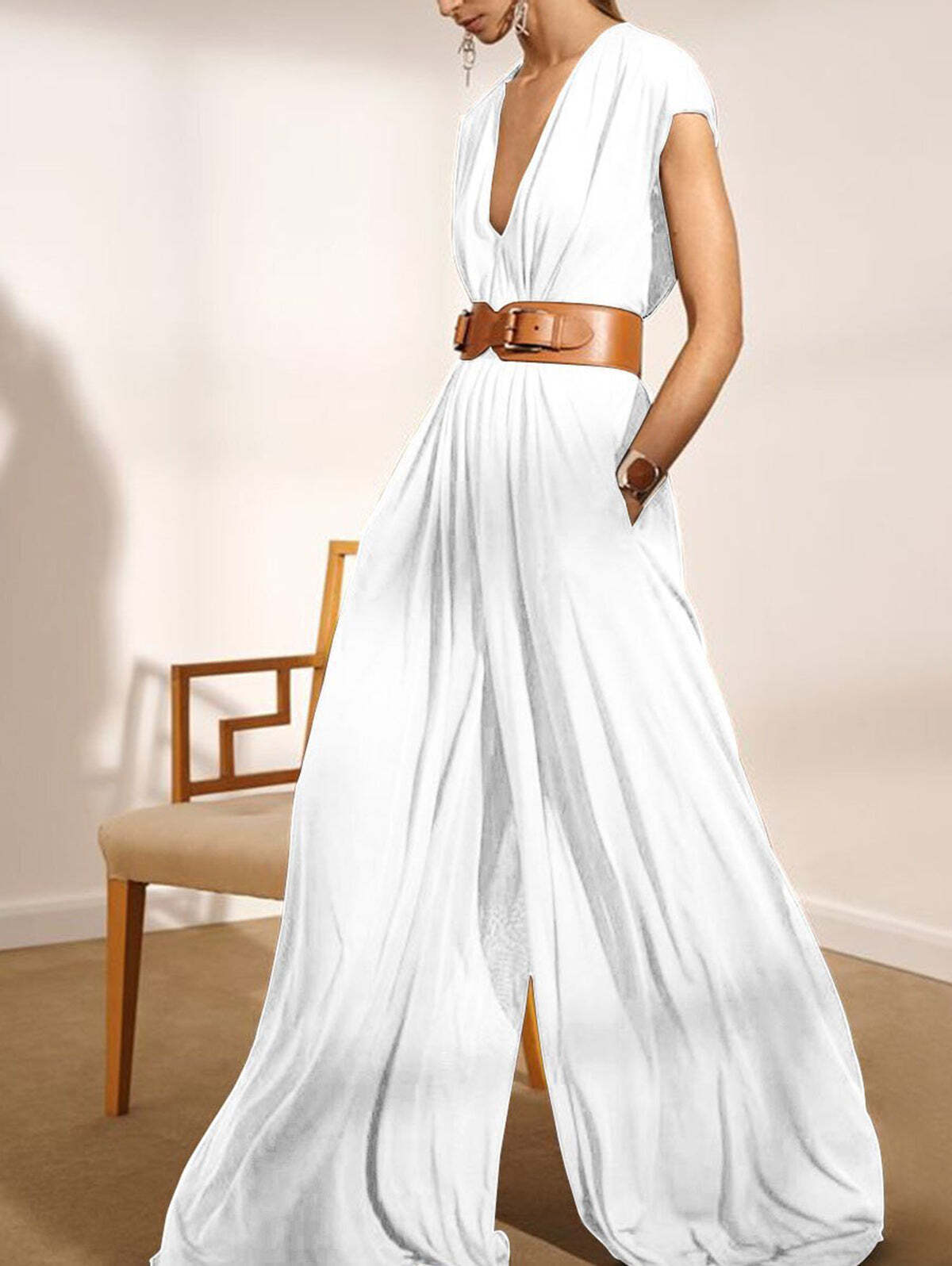 Elegant Plain Deep V Neck Sleeveless Plus Size Jumpsuit