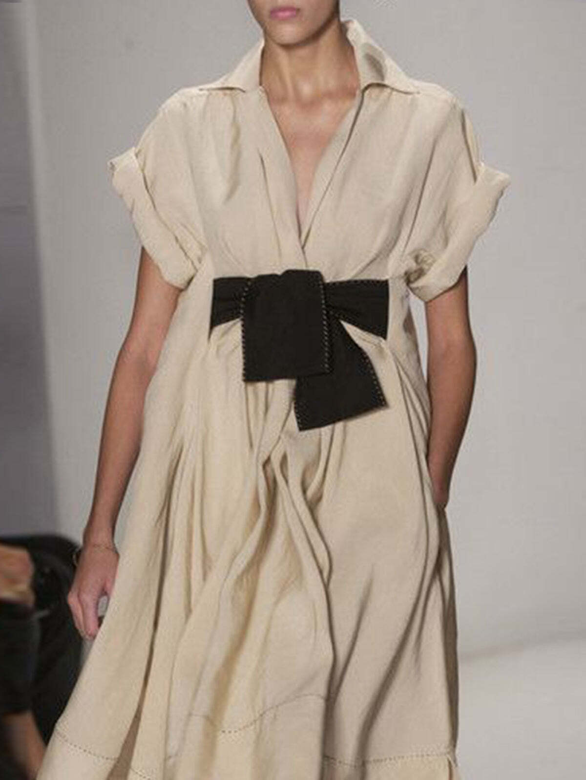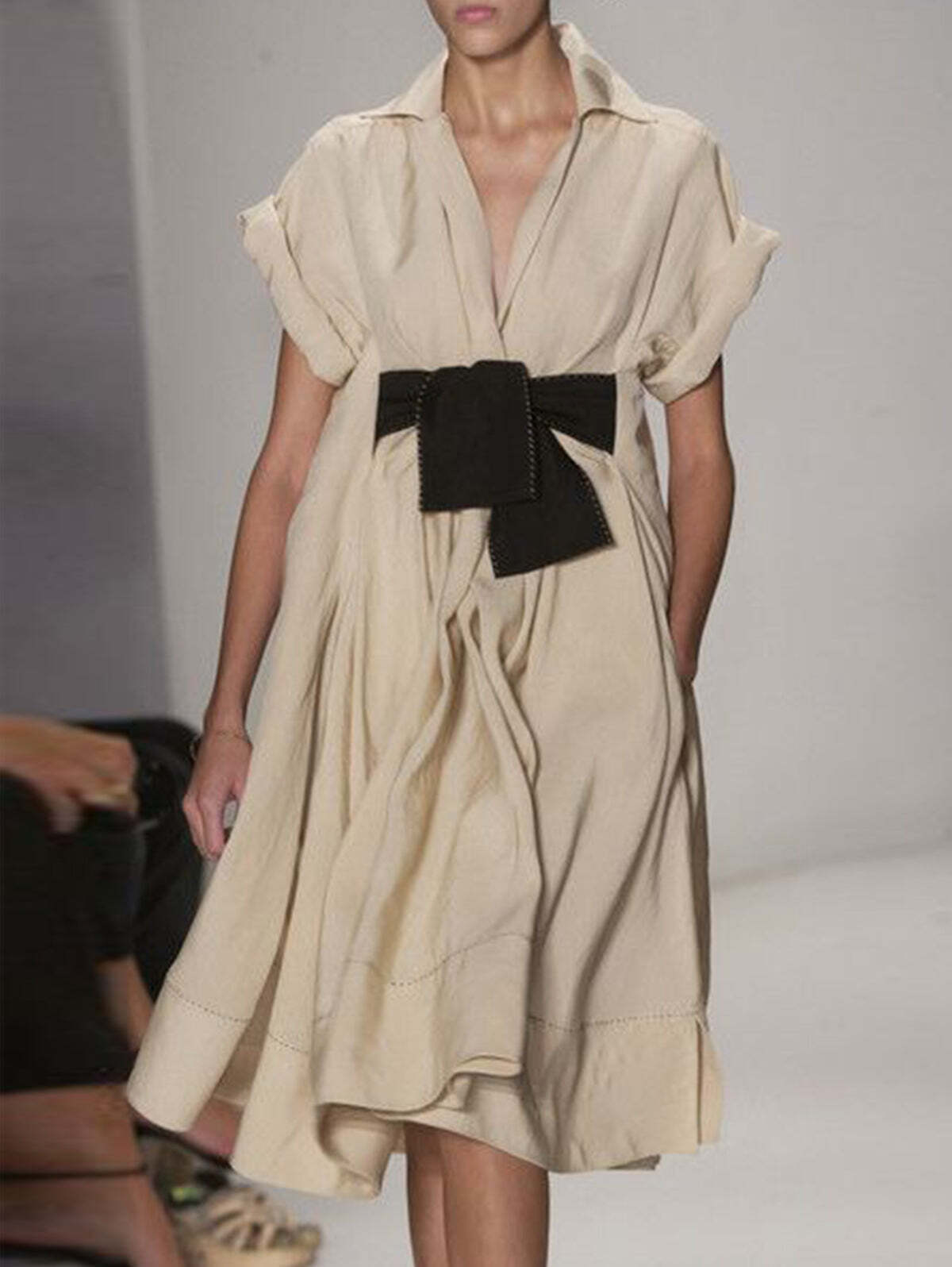 Elegant Plain Lapel Collar Short Sleeve Midi Dress