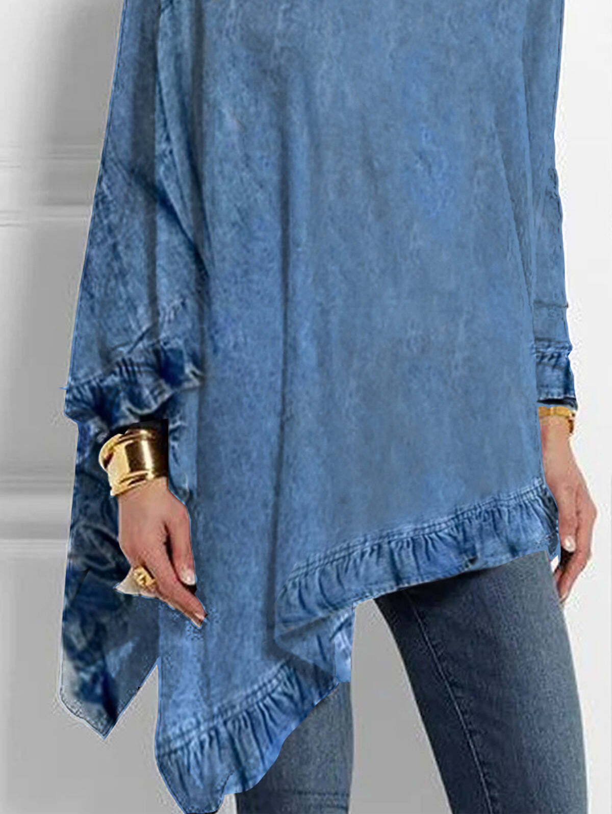 UR Elegant Plain High Neck Long Sleeve Diagonal Ruffle Hem Blouse