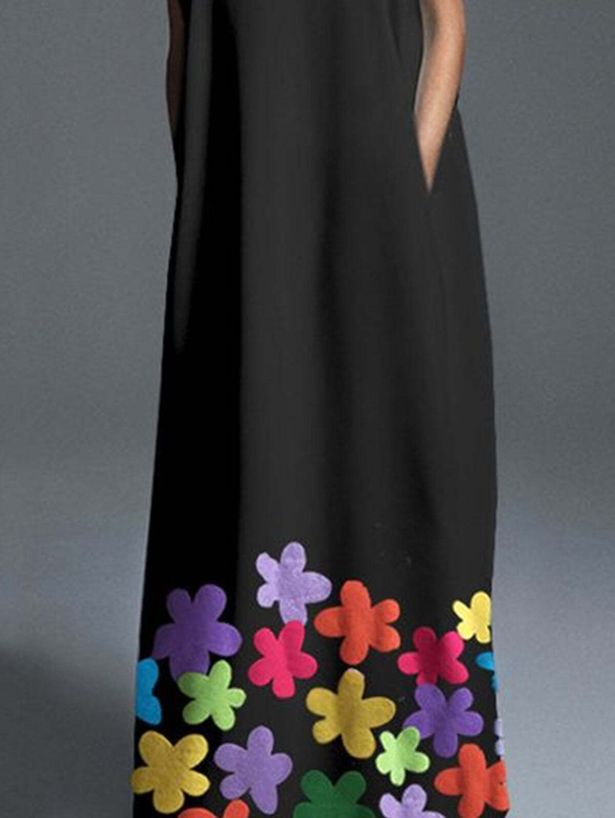 Elegant Plain Floral V Neck Short Sleeve Loose Pocket Maxi Shift Dress