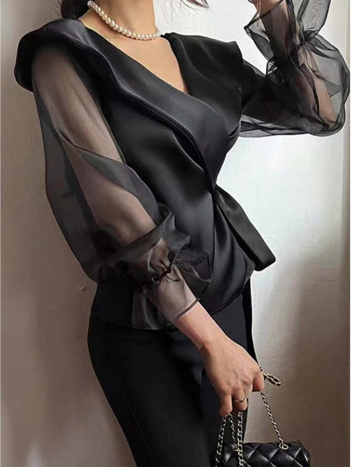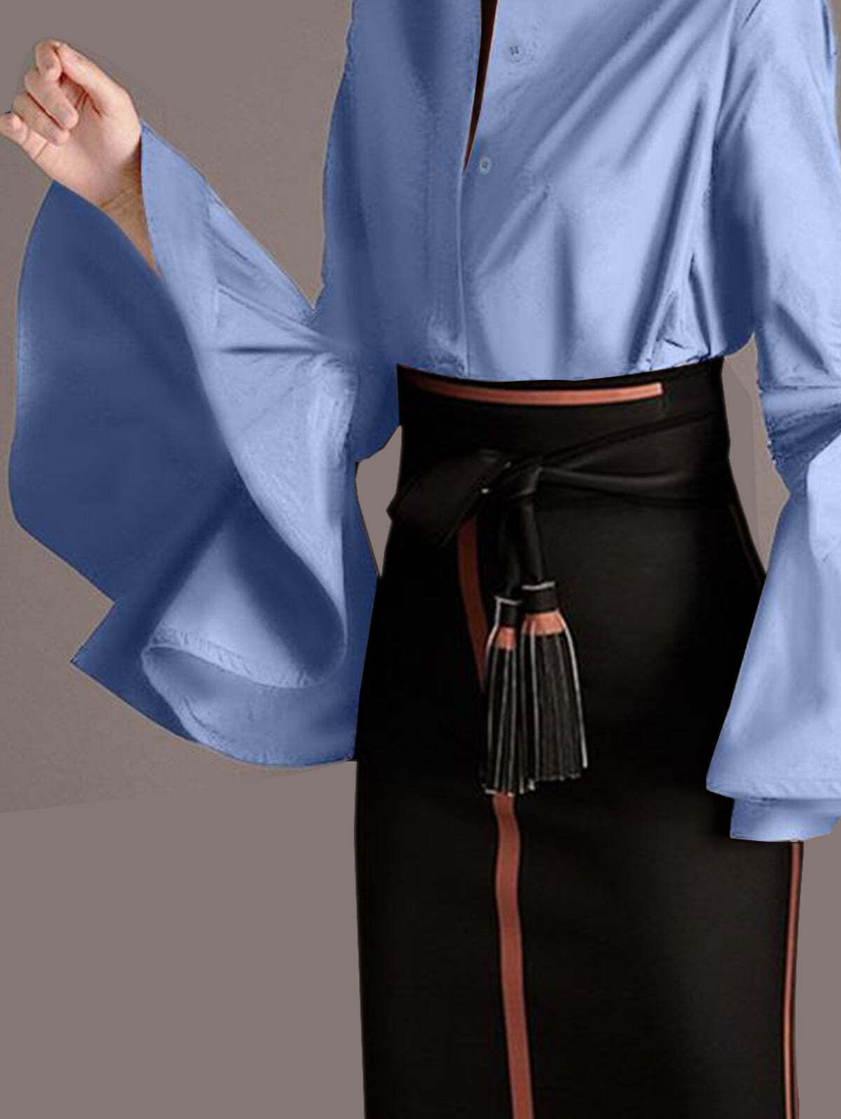 Elegant Plain Mock Neck Tie Arm Trumpet Sleeve Shirt
