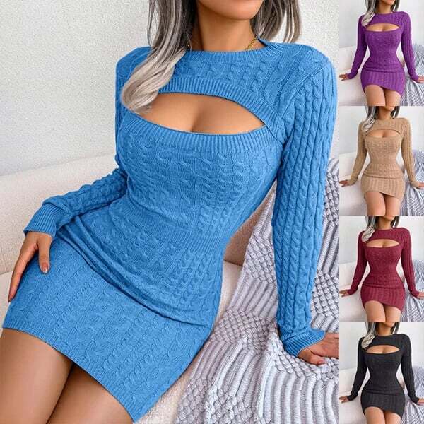 Sexy hollow twist waist wrapped hip skirt sweater dress