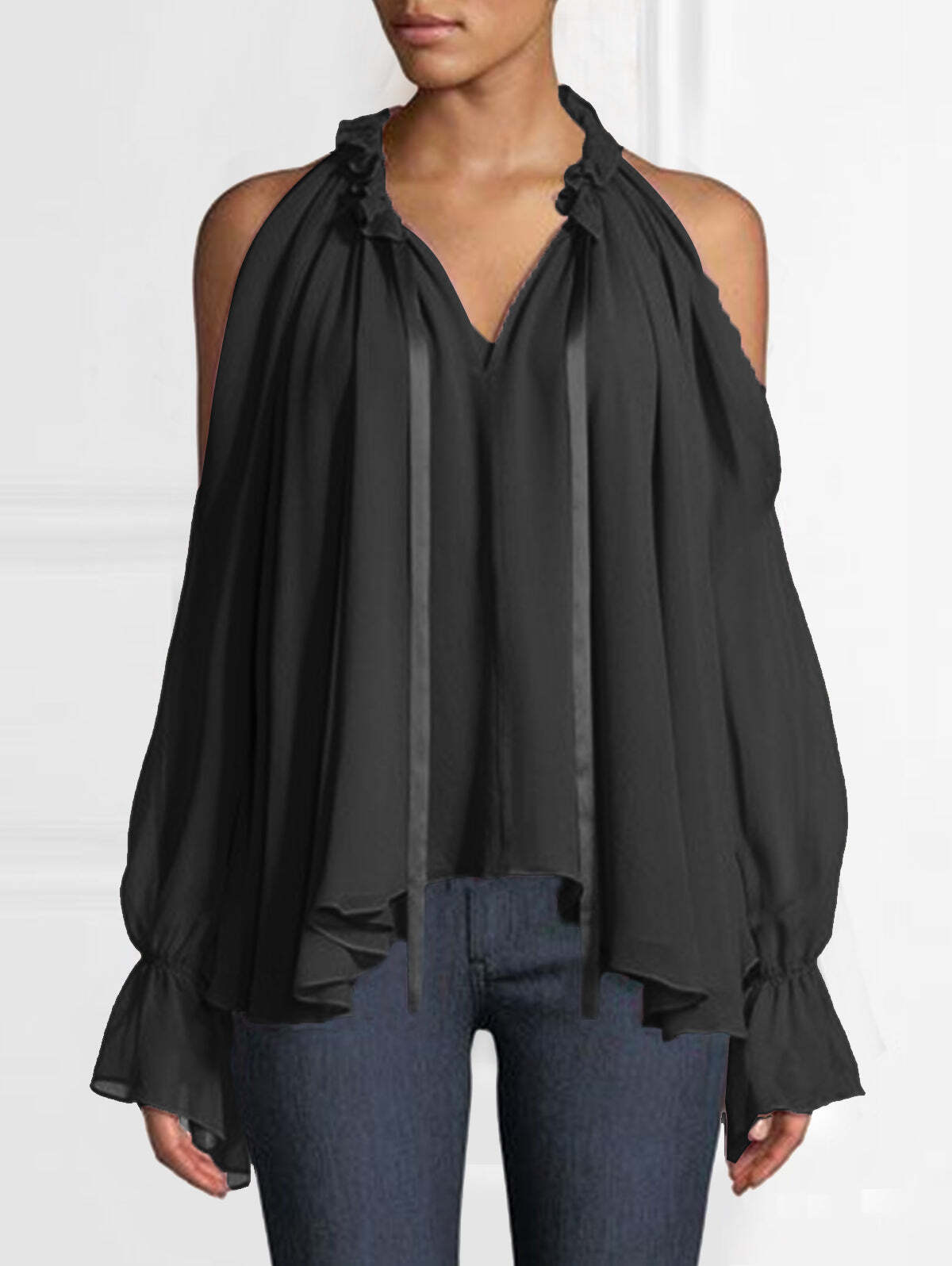 Elegant Plain Cold Shoulder Long Sleeve Ruffle Gathered Blouse