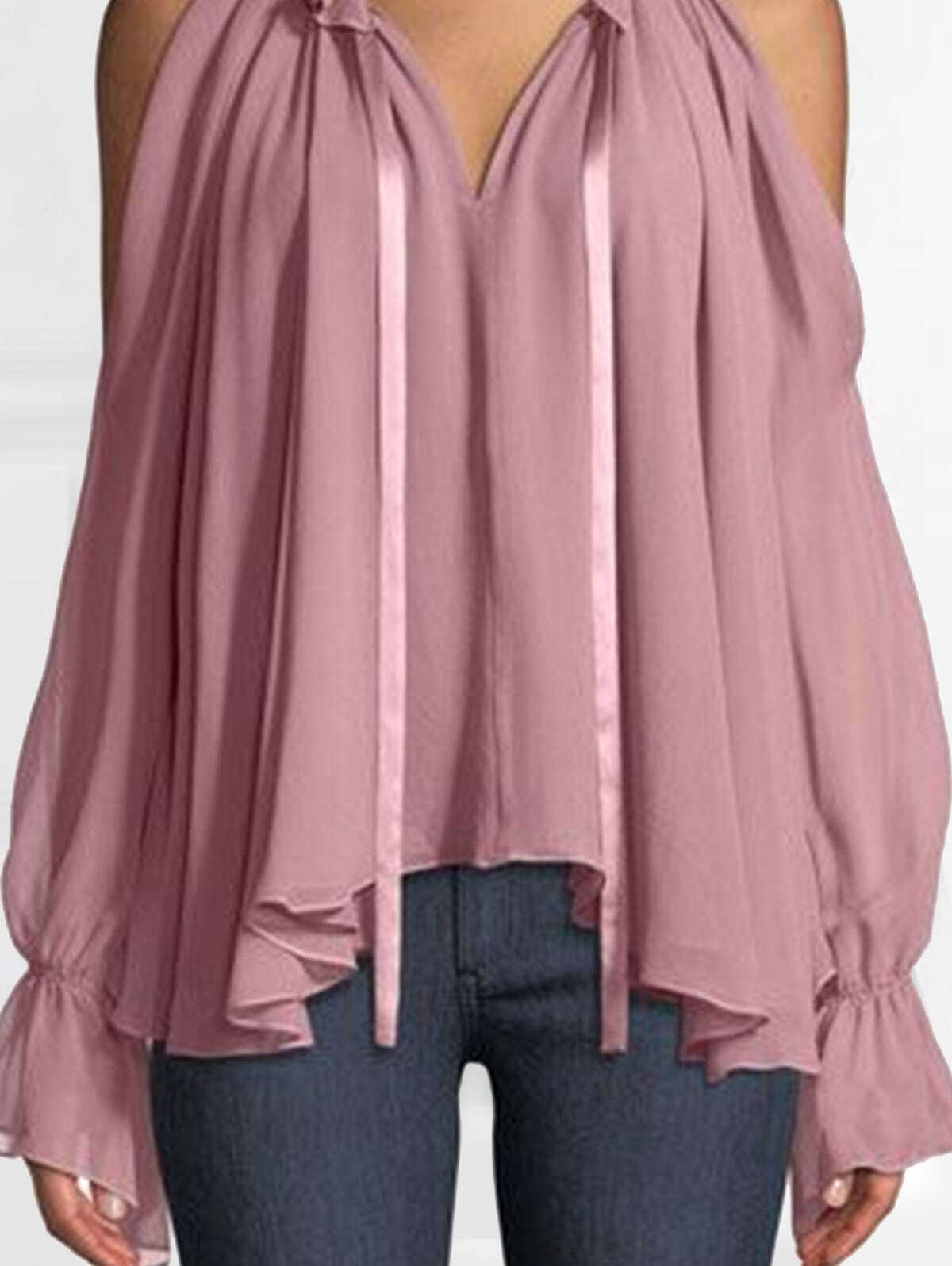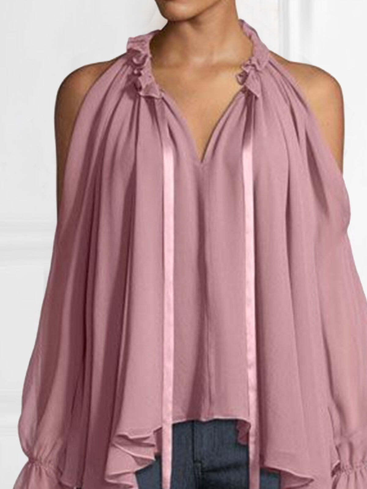 • Elegant Plain Cold Shoulder Long Sleeve Ruffle Gathered Blouse